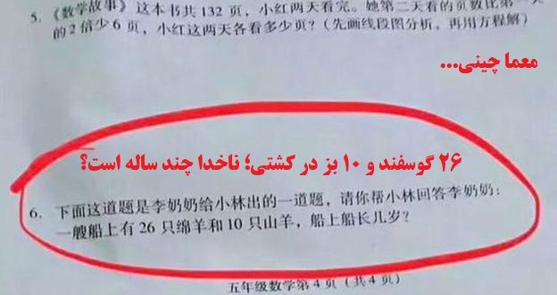 سئوال ریاضی (۲۶ گوسفند و ۱۰ بز در کشتی؛ ناخدا چند ساله است؟) به ظاهر غیر قابل حل در چین باعث شگفتی دانشآموزان و کاربران شبکههای اجتماعی شده است. دانشآموزان یک مدرسه ابتدایی در منطقه شونکینگ در شهر نانچونگ با این سئوال در ورقه امتحانی روبهرو شدند “اگر در یک کشتی ۲۶ گوسفند و ۱۰ بز باشند، ناخدای کشتی چند ساله است؟”