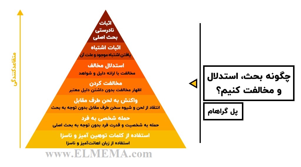 در سال ۲۰۰۸ آقای پاول گراهام (Paul Graham) مدلی را جهت بیان مخالفت متقاعدکننده ارائه داد که در آن انواع مخالفت کردن در ۷ سطح طبقه بندی شده است.